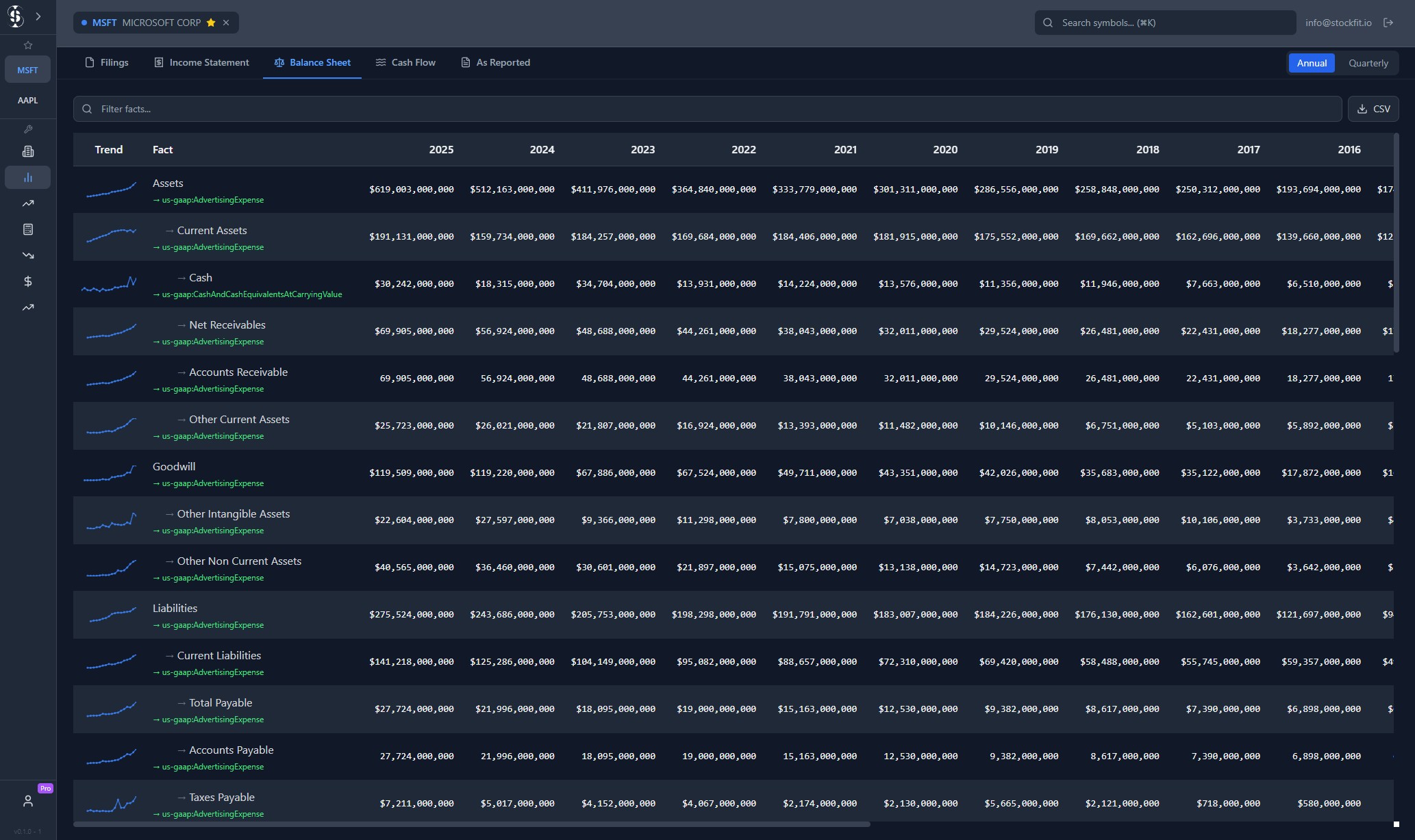 Compare multiple companies side-by-side with synchronized charts. Analyze Revenue, Net Income, profit margins, and financial ratios across decades of SEC filing data for informed long-term investment decisions.